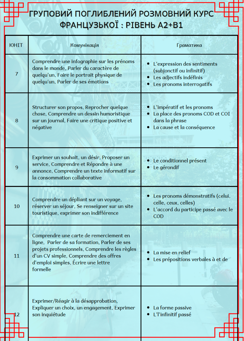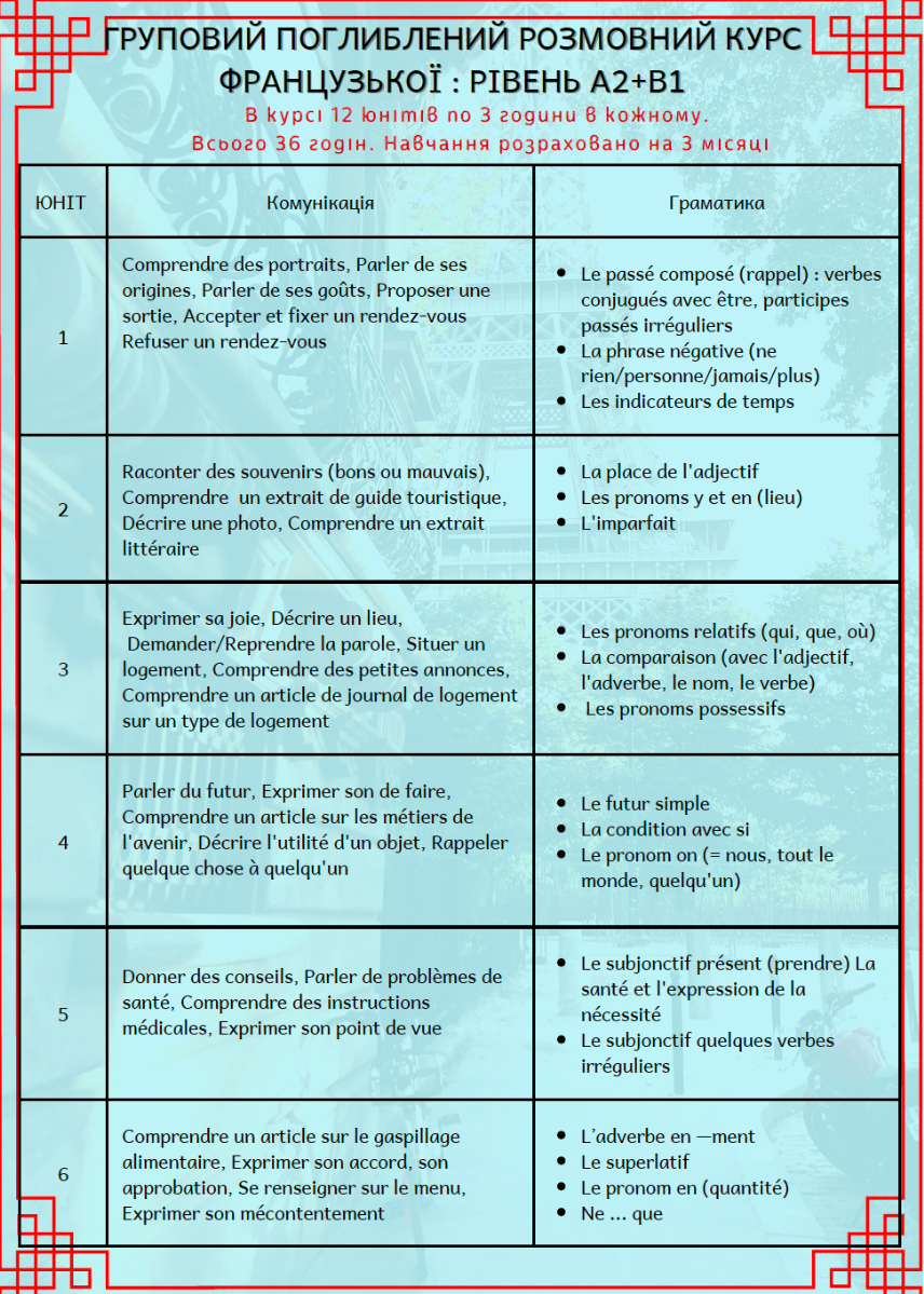 Три рази на тиждень поглиблений курс французької мови, під час якого працюють всі чотири види мовної діяльності: