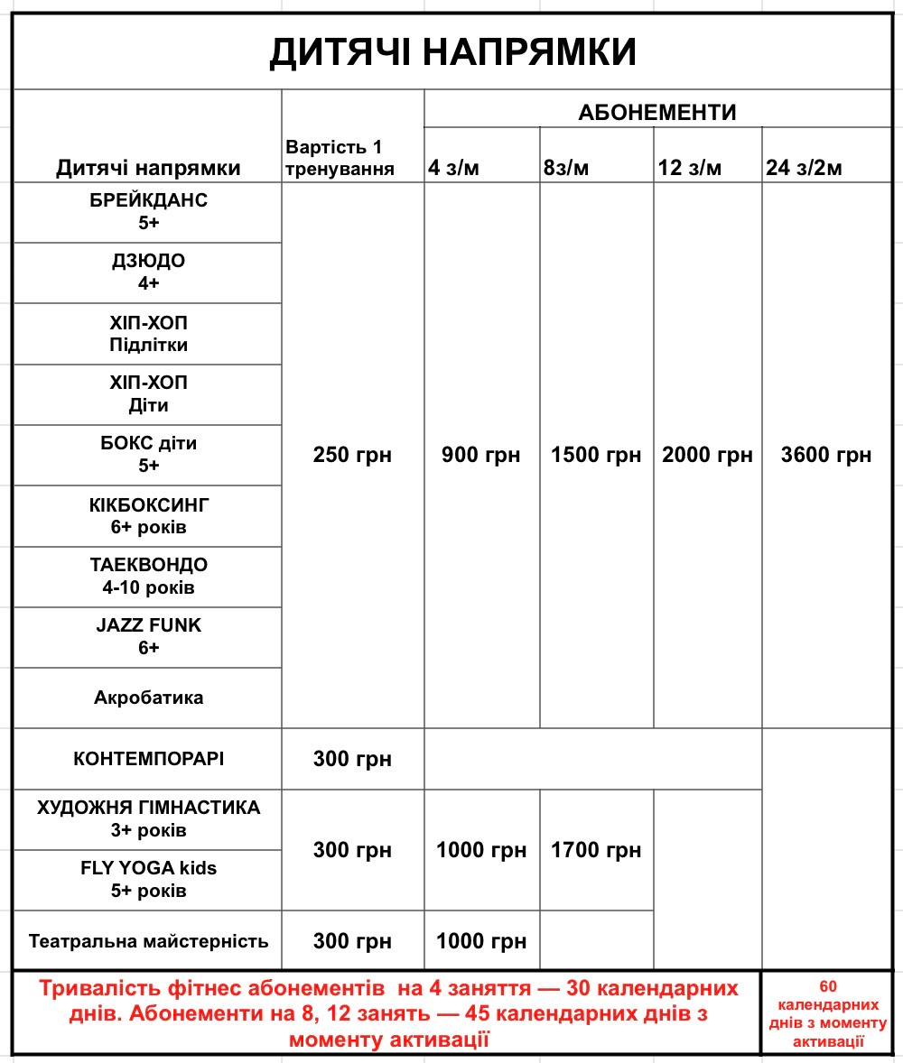 🚸Тривалість дитячих абонементів на 4 тренування — 30 календарних днів. Тривалість дитячих абонементів на 8, 12 тренувань — 45 календарних днів з моменту активації