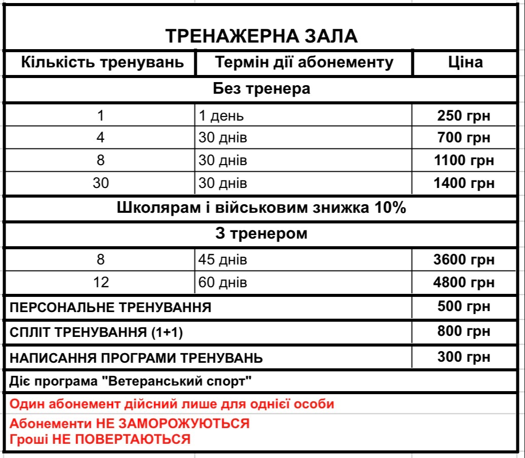 Instagram Telegram VIBER Спільнота Facebook TikTokАБОНЕМЕНТИ В ТРЕНАЖЕРНУ ЗАЛУ
