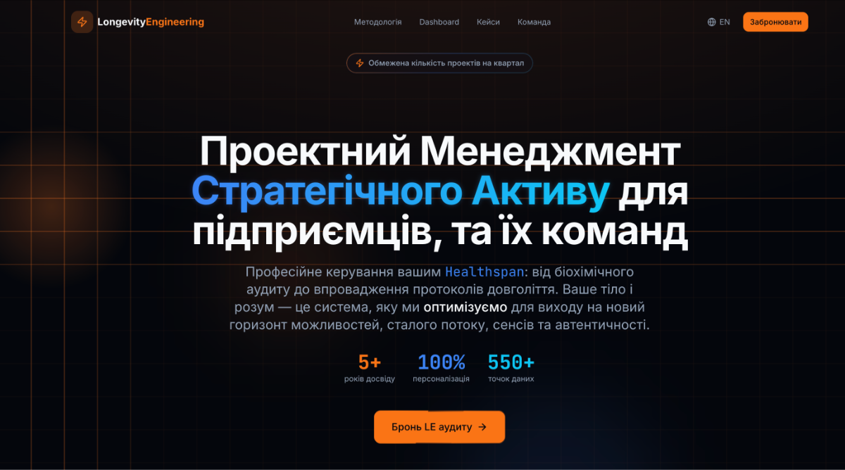 • Інструменти: Аналіз панелей крові, генетика, біометрія (WHOOP), пептидні стратегії.