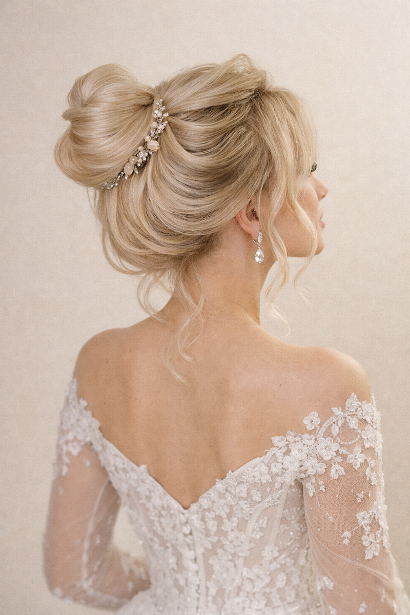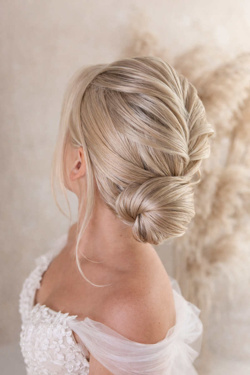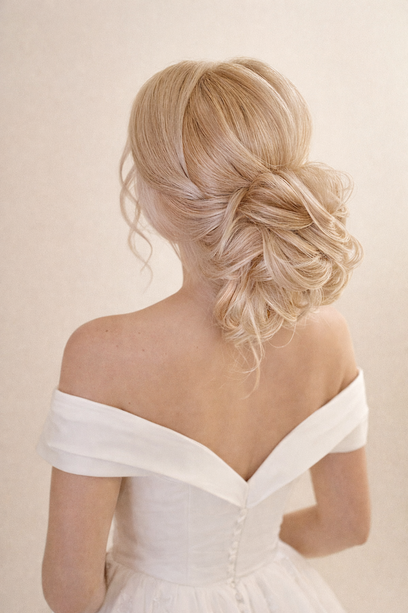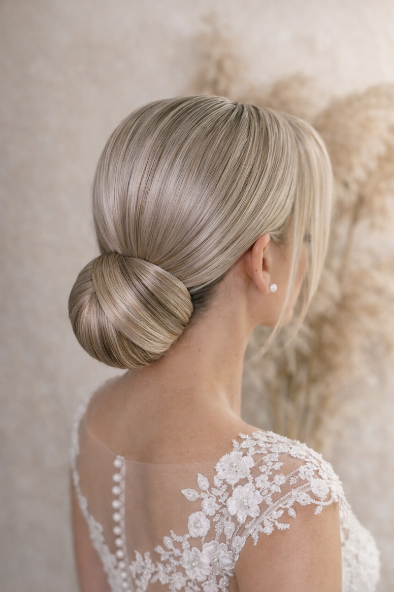 Гладкий низький пучок в класичному стилі. Форма наближена до «бабетти», але в комерційному виконанні⬇️
